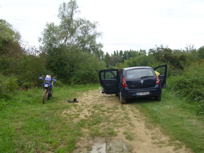 kurz entschlossen mit dem kleinen Zelt dazu gestellt,da abzusehen war dass wir die ca. 200 Km bis zu unserem angepeilten